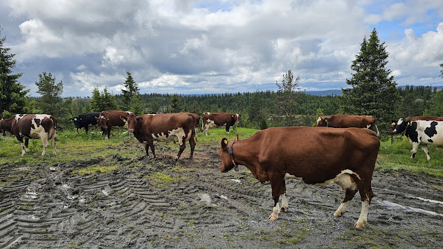 Jeg måtte gjennom en flokk kyr like etter Lauvset som motvillig flyttet seg da jeg kom, inntil en kvige irriterte seg så kraftig over meg at hun jogget bestemt etter meg for å få meg vekk. Jeg brukte sykkelen som et slags skjold når hun hadde utfall mot meg mens jeg trakk meg forsiktig tilbake samtidig som jeg forgjeves forsøkte å snakke henne til fornuft.